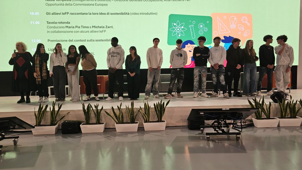 Manuela, Studentessa Engim, ha introdotto la proiezione del video racconto realizzato con i contributi dei 15 elaborati, da altrettanti enti, arrivati da tutta la regione leggendo un testo che ha riassunto con immediatezza il cuore della giornata: la sostenibilità non è una parola “da grandi”, ma un’abitudine, una cura, la capacità di non sprecare né risorse né persone. È aggiustare, recuperare, valorizzare; è essere visti, accompagnati, ascoltati. Una fotografia limpida del significato educativo dei percorsi IeFP.